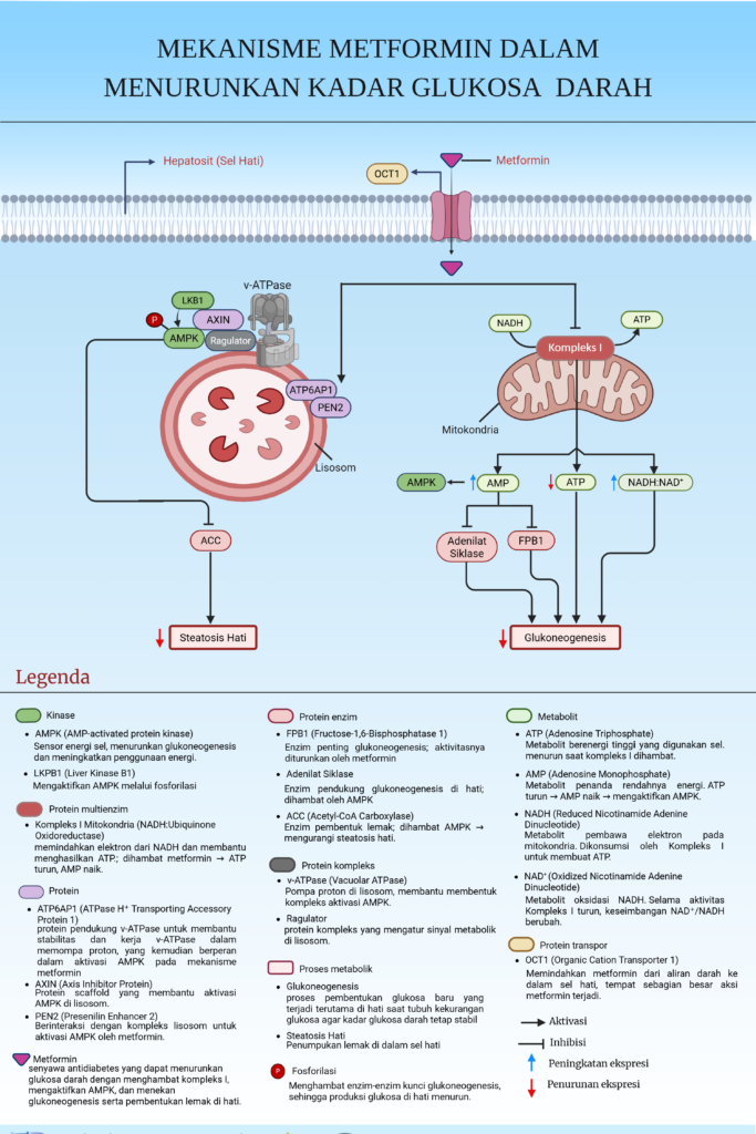 Dengan menghubungkan lisosom, AMPK, glukoneogenesis, dan steatosis hati, ilustrasi ini menegaskan bahwa metformin tidak bekerja sebagai “obat penurun gula” yang sederhana. Sebaliknya, metformin bertindak sebagai pengatur ulang keputusan metabolik hepatosit, mengalihkan sel hati dari mode produksi glukosa dan penyimpanan lemak menuju mode efisiensi energi dan homeostasis. Perspektif ini memperkuat pemahaman bahwa diabetes tipe 2 adalah penyakit disregulasi metabolik seluler, dan bahwa intervensi efektif harus menarget pusat pengambilan keputusan metabolik, bukan hanya gejala akhirnya berupa hiperglikemia.